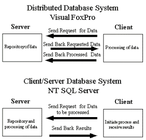 Client-server is a system that centrally processes databases and sends the results of commands back to clients. This centralized processing scheme is excellent for databases that require large numbers of users and/or remote access. The Microsoft SQL Server for Windows NT database is also very popular due to its excellent security, ability to handle vast amounts of transactions, fail safe operation and scalability. The following figure illustrates the difference between a distributed database such as Microsoft Visual FoxPro™ and a centralized or client-server database such as Microsoft SQL Server for Windows NT.