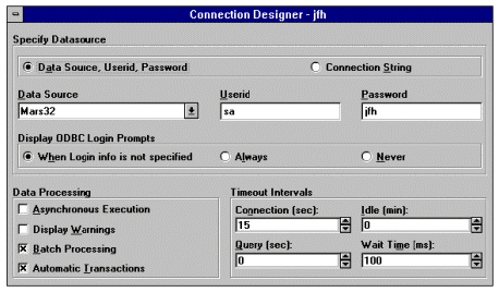 DATASOURCE 'Mars32' USERID 'sa' PASSWORD 'homnick'