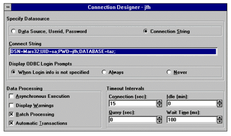 CONNSTRING 'DSN=Mars32; UID=sa; PWD=homnick; DATABASE=pubs;'