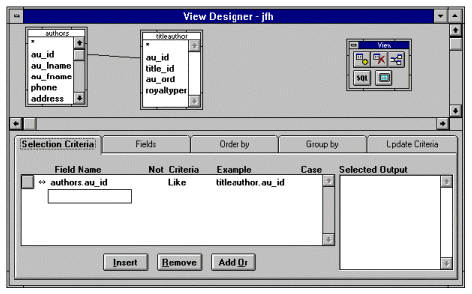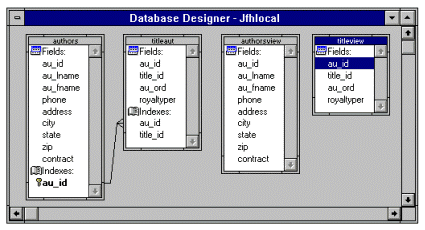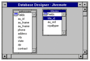 The local database container holds two views. The first one is based upon the local authors table and the second on the local titleaut tables. The remote designer window looks exactly the same as the local one concerning the two views. There are however two important differences. First, of course, the JHREMOTE tables reside on the server. Secondly, the titleview view is based on the titleauthors table on the server as opposed to titleaut locally. Note how through the use of views the naming capabilities of different systems is no longer a factor.