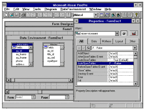 We are adding the local views to the forms data environment and will be modifying some of the properties of this environment. First, the AutoOpenTables properties must be set to .F. - False. If this property is True the form will automatically open the tables in JFHLOCAL, which would destroy the cross platform effect desired. We will see later on how we manually open the tables in code. Secondly, the buffering properties of both cursors need to be changed since remote views require some sort of optimistic locking scheme. In this example, we change the Cursor1 (authorsview) buffering property to 3 - Optimistic Record Locking and the Cursor2 (titleview) buffering property to 5 - Optimistic Table Locking. Finally, since we are going to be opening up our own table we set the DataEnvironment InitialSelectedAlias property to authorsview.