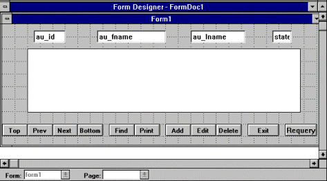 Using the data environment, we drag and drop the authorsview fields onto the form. For this exercise, lets use au_id, au_fname, au_lname and state. We can create a grid from the titleview table by dragging the whole table from the data environment and dropping it on the form. The data control panel that I use comes from the Visual FoxPro Wizard class library called WIZSTYLE.VCX. By adding this visual class library to my forms control toolbar, I can then place the TxtBtns class onto my form. This gives me navigation, find, print, add, update, delete and exit capabilities. Since we are working with a parameterized view as our master table (authorsview) we need a facility to refresh that view. We do this by adding a Requery button at the end of the TxtBtns class.
