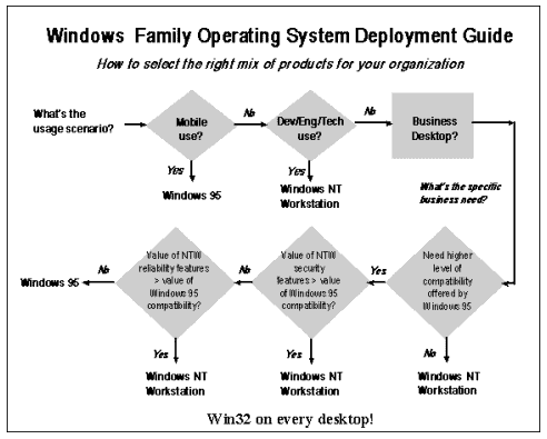 For the business desktop, you need to examine the business problem you’re trying to solve. It is very likely that you’ll want to deploy both products in your organization today. For instance, your human resources department may require the high level of security and protection of Windows NT Workstation, while many others parts of your organization will deploy Windows 95. To determine the right combination of Windows 95 and Windows NT Workstation that is best for your business, you need to address the following: